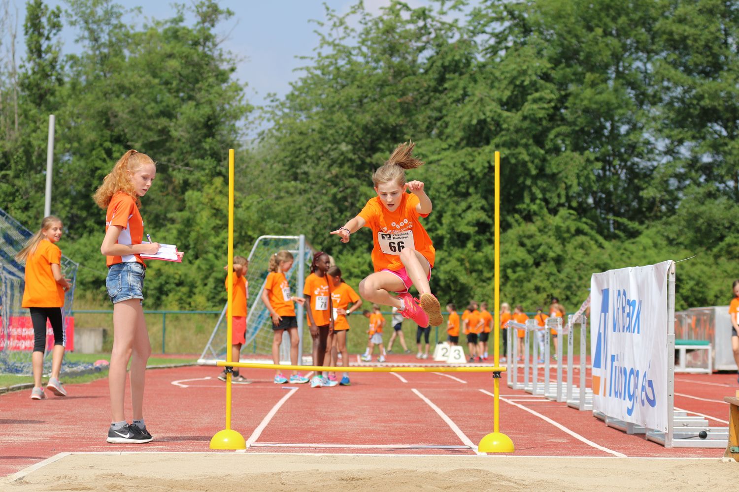 Beim Einmarsch durch das Spalier der Gomaringer Helfer, unter denen auch einige Topathleten, wie Gianni Seeger oder Karolin Sauer waren, fühlten sich die Kinder „richtig prominent“, wie eins der Mädchen beeindruckt äußerte. Eine kurze Begrüßung durch Bürgermeister Steffen Hess, ein fetziges Aufwärmprogramm mit Alexander Seeger und schon ging es an die Stationen, die im Rundlauf in einer Stunde absolviert wurden: 20 m-Sprint, 40 m-Hürdensprint, Weitsprung und Heulerballwurf wurden von den 9 Teams ohne große Wartezeiten durchlaufen, und auch die anschließenden stimmungsvollen Staffelläufe gingen reibungslos vonstatten. Nach drei Stunden war sogar schon die Siegerehrung durch, die vom Marketingleiter der Volksbank Tübingen, Alexander Pahl, und vom Jugendwettkampfwart des WLV, Johannes Lohrer, durchgeführt wurde. Für die große und großzügige Unterstützung durch den Sponsor Volks- und Raiffeisenbanken, die Gemeinde Gomaringen und den örtlichen TSV sei an dieser Stelle nochmals ein herzliches Dankeschön gesagt.