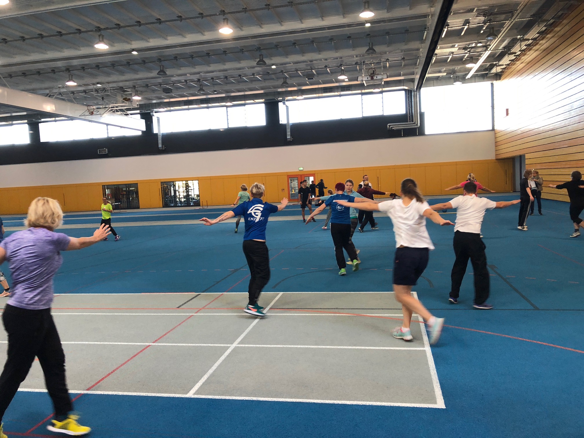 Nach einem ausgiebigen Mittagessen im Sportrestaurant Neckarpark mit einer Vielzahl an interessanten Gesprächen und mit regem Austausch zwischen den Teilnehmerinnen ging es im Seminarraum weiter. Florian Bauder als Landestrainer Mehrkampf stellte zunächst in einer kurzweiligen Präsentation die Möglichkeiten und Varianten im Training mit größeren Gruppen vor,bevor es dann in der Halle an das praktische Üben und Ausprobieren ging.