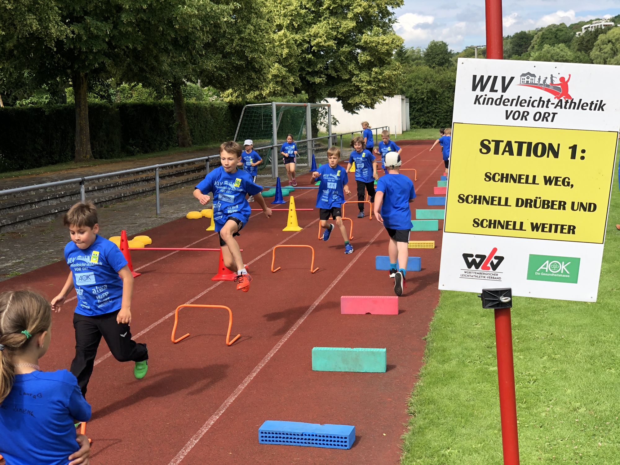 Die motivierten Helfer rund um Trainerin Christine Geldbach begrüßten bei strahlendem Sonnenschein das WLV-Team. Die 8 Stationen waren schnell aufgebaut, sodass alles bereitstand, als die Kinder eintrafen. Ausgestattet mit blauen T-Shirts gesponsert von der AOK und weiteren Projekt-Partnern konnte der spannende Sporttag beginnen. WLV-Praktikantin Maike Anstett bekam zum ersten Mal für die gesamte Veranstaltung das Mikrofon in die Hand und konnte damit innerhalb ihres Praktikums erste Moderations-Erfahrung sammeln.