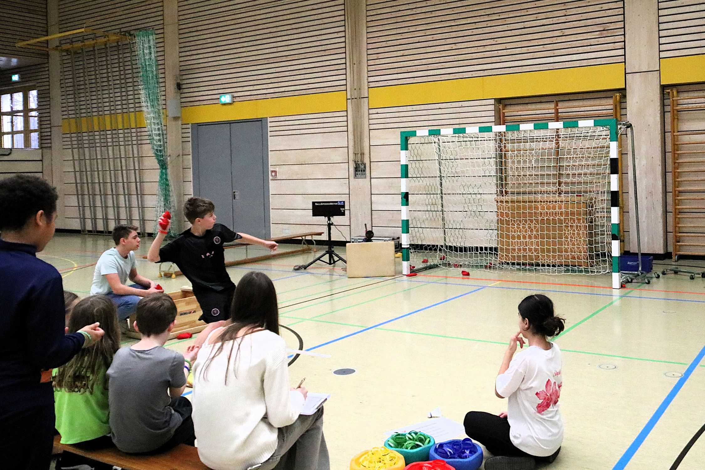 Dafür werfen die Schüler:innen mit einem Sandsäckchen auf ein Handballtor, ein Speedometer misst, wie schnell das Säckchen sein Ziel findet. Motiviert durch die Anfeuerungsrufe des Stationshelfers wuchsen die Schüler:innen über sich hinaus und Geschwindigkeiten von über 70 km/h waren keine Seltenheit.